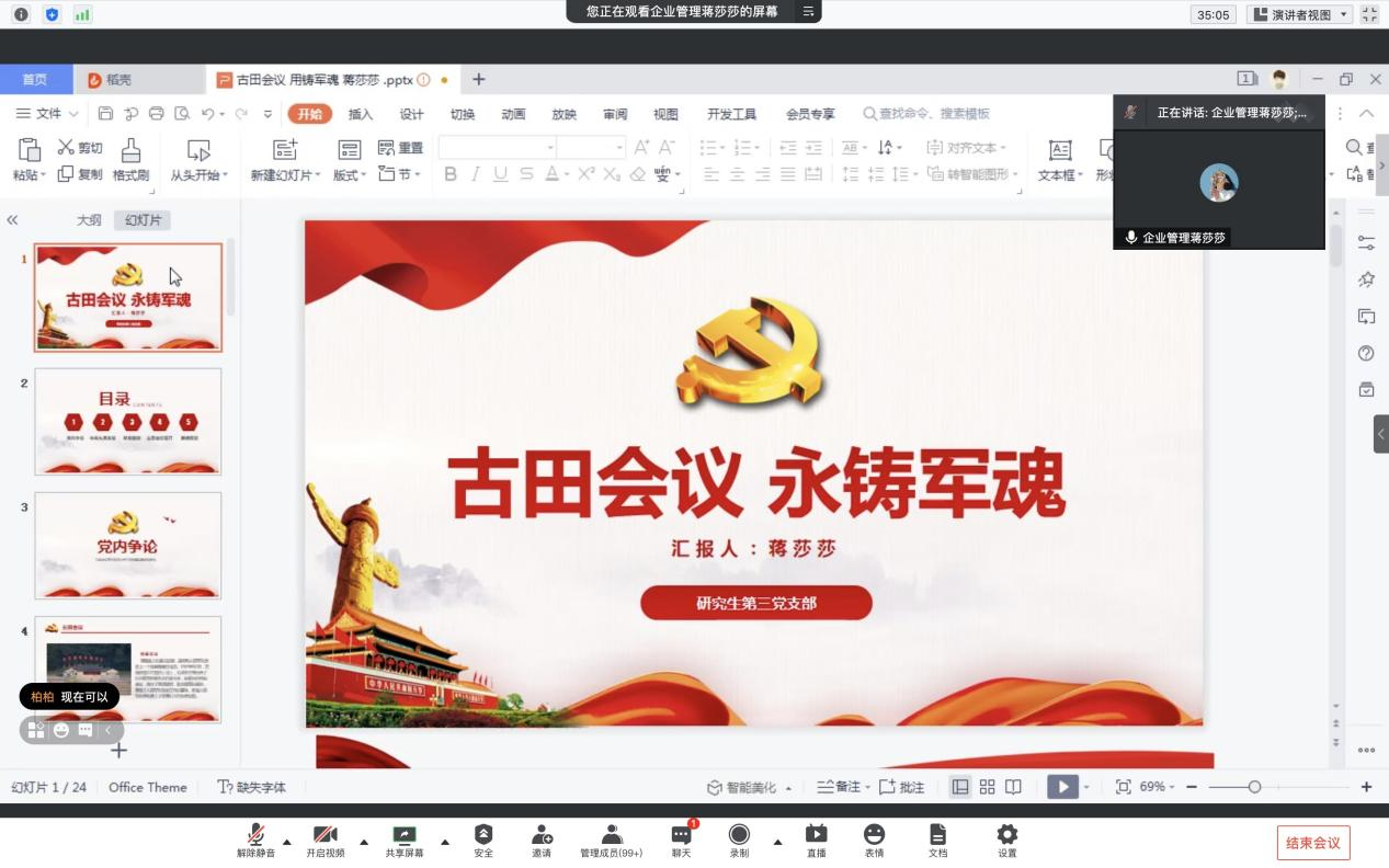 之后,蒋莎莎同学以 “古田会议,永铸军魂”为主题与大家分享了古田精神。依次从党内争论、中央九月来信、新泉整训到古田会议召开四个部分,讲述了古田会议召开的背景和重要意义,它奠定了人民军队政治工作的基础。最后,蒋莎莎同学讲述作为中国共产党员,在任何时候任何情况下都要以党的旗帜为旗帜、以党的方向为方向、以党的意志为意志。