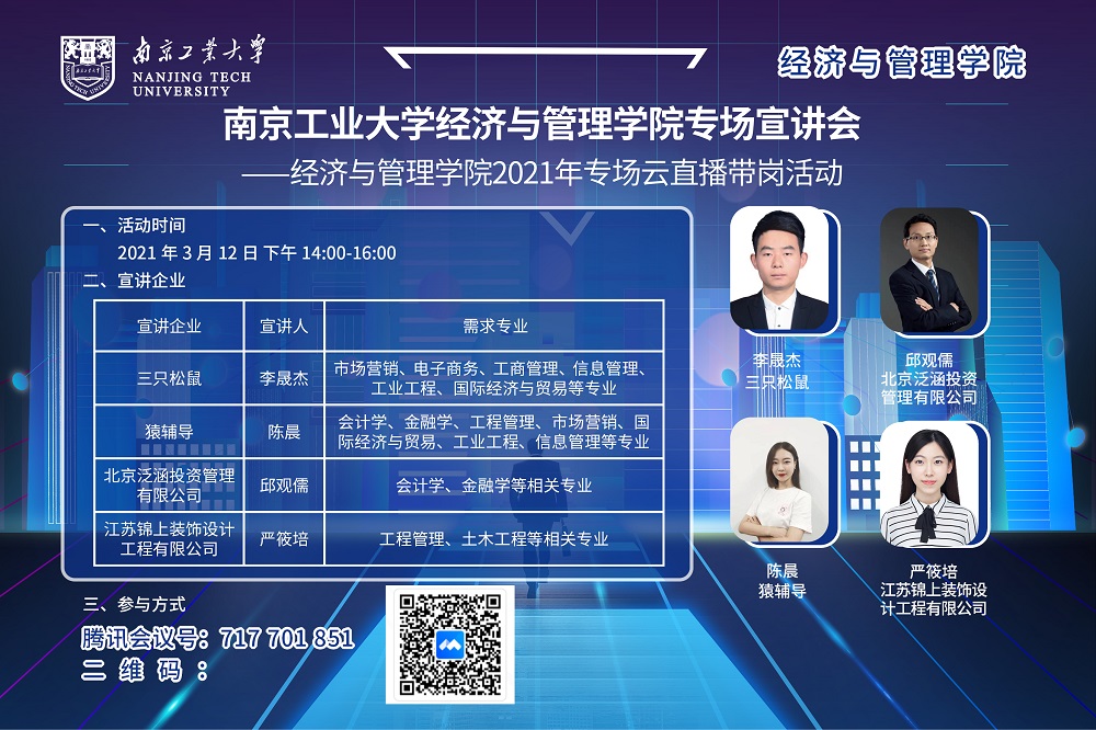 2021年3月12日下午两点,365英国上市公司举办了多家企业联动招聘的专场云直播带岗活动。本次活动邀请了三只松鼠人事部校招负责人李晟杰、猿辅导南京分公司校招负责人陈晨、北京泛涵投资管理有限公司副总裁邱观儒以及江苏锦上装饰设计工程有限公司招聘主管严筱培等人作为此次云直播“带岗人”。