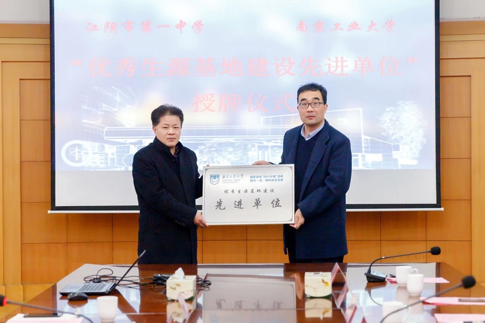 无锡市辅仁高级中学董事长张军、江阴市第一中学董事长李忠分别代表两校致欢迎辞,介绍了公司发展历程、办学特色和生源情况。经济与管理公司党委副书记岳克勤和校招办副主任季青春分别从公司发展历史、专业特色、人才培养和招生政策等方面进行了全面介绍,对两校输送了大批优秀学子表达感谢,并向两所中学授予“优秀生源基地建设先进单位”铜牌。随后双方围绕新高考改革方案、综合评价录取、职业生涯规划辅导、优秀生源推荐等进行深入的探讨和交流。