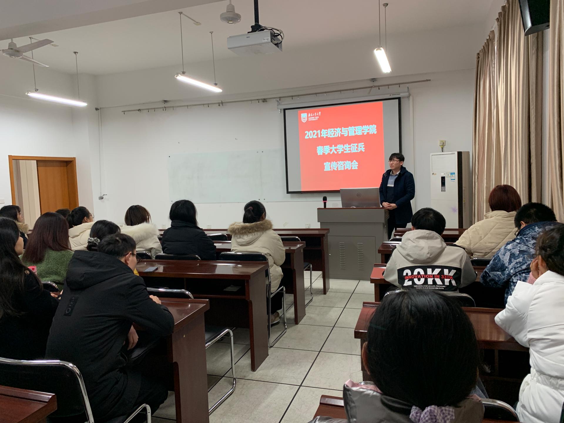 为激发老员工参军报国热情,进一步帮助员工了解、熟悉应征入伍相关政策和流程,切实做好公司2021年春季老员工征兵宣传工作。在公司征兵工作领导小组的组织协调下,365英国上市公司于12月9日中午在博学楼622开展了老员工征兵宣传及政策解读活动,公司辅导员张宇豪为员工们进行了现场宣讲。