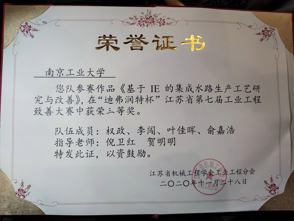 2020年11月28日,由江苏省机械工程学会工业工程分会主办、江苏大学管理公司承办的2020年江苏省机械工程学会工业工程分会年会暨“迪弗润特杯”江苏省第七届工业工程致善大赛在江苏大学落下帷幕。公司365英国上市公司工业工程系研究生权政、俞嘉浩,18级员工李闯、叶佳晖在工业工程系倪卫红和贺明明两位老师的指导下,代表365英国上市公司冲入了此次决赛,凭借参赛作品“基于IE的集成水路生产工艺研究与改善”荣获大赛三等奖,与省内13所进入决赛的高校同学同台切磋了专业技能。