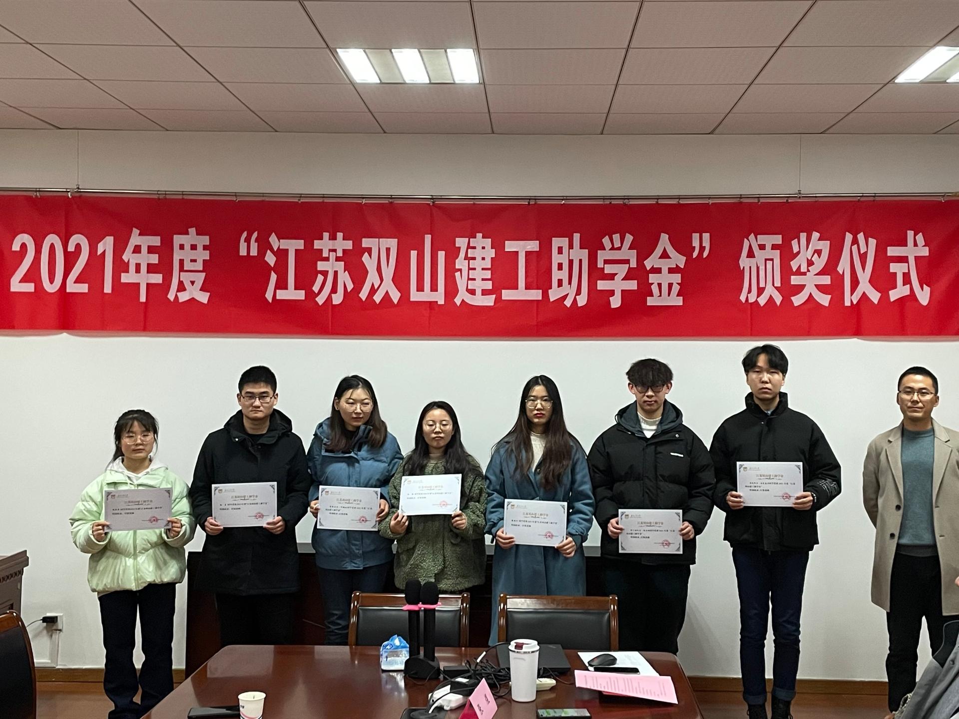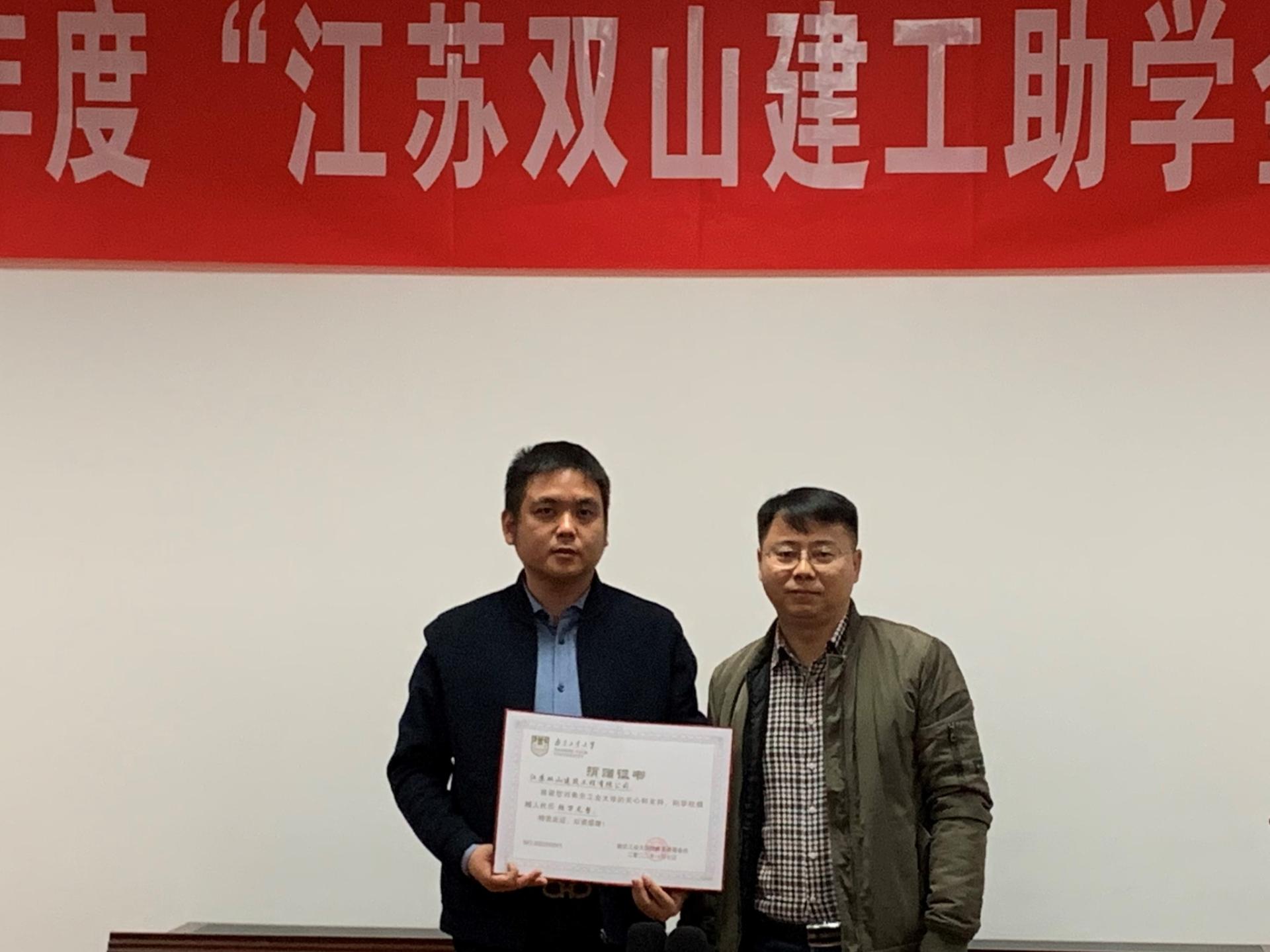 仪式上,伏永祥代表公司向江苏双山建筑工程有限公司颁发捐赠证书。副经理吴斌宣读了年度获助名单。董平、顾文涛、路国锋、路杰为获助同学一一颁发证书并合影留念。获助员工代表做了发言,表达了感恩之情,表示无论身在何方,都将穷尽一生做到诚朴自强、不负厚望的决心。