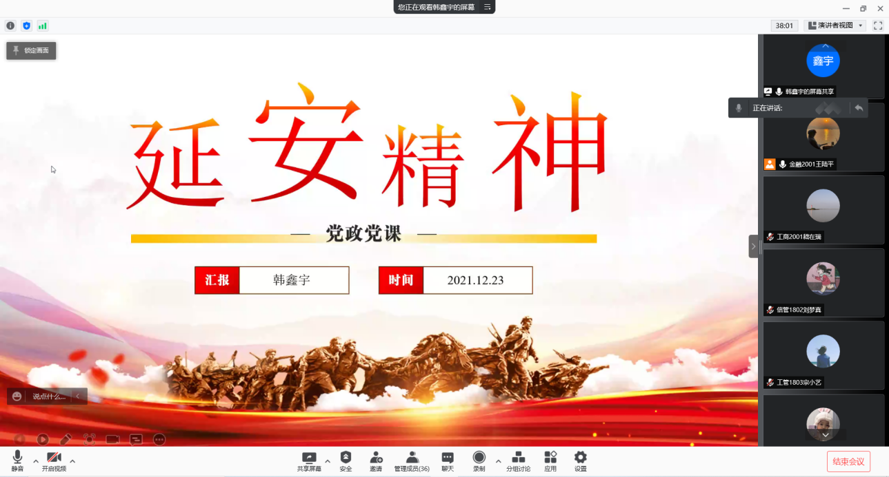 传承延安精神,赓续精神血脉。韩鑫宇同学带领大家一起学习了延安精神的丰富内涵,探讨了延安精神的当代价值,激励同学们从延安精神中汲取力量,继续传承和发扬艰苦奋斗、知难而上、奋勇前行的精神。同学们纷纷表示将会继承和发扬延安精神,用党的光荣传统和优良作风坚定信念、凝聚力量。