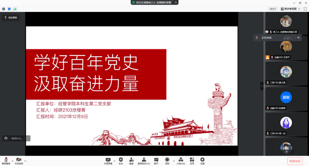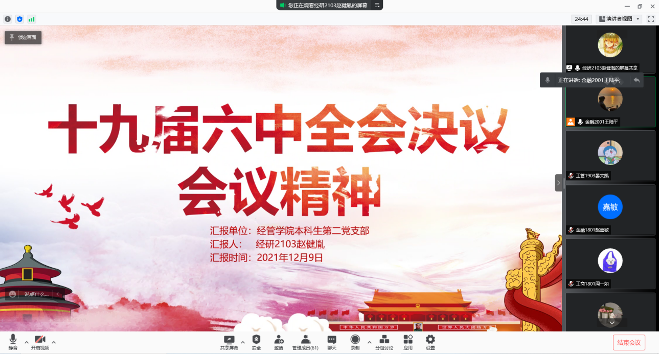 为认真学习贯彻党的十九届六中全会精神,教育广老员工深入解读全会的丰富内涵、重要成果和历史意义。12月9日,365英国上市公司通过腾讯会议直播平台开展了第十六期“学思践悟温‘四史’·奋发有为强知行”主题微党课,开展专题学习。本次学习由本科生第二党支部洑樱菁和赵健胤同学担任主讲。
