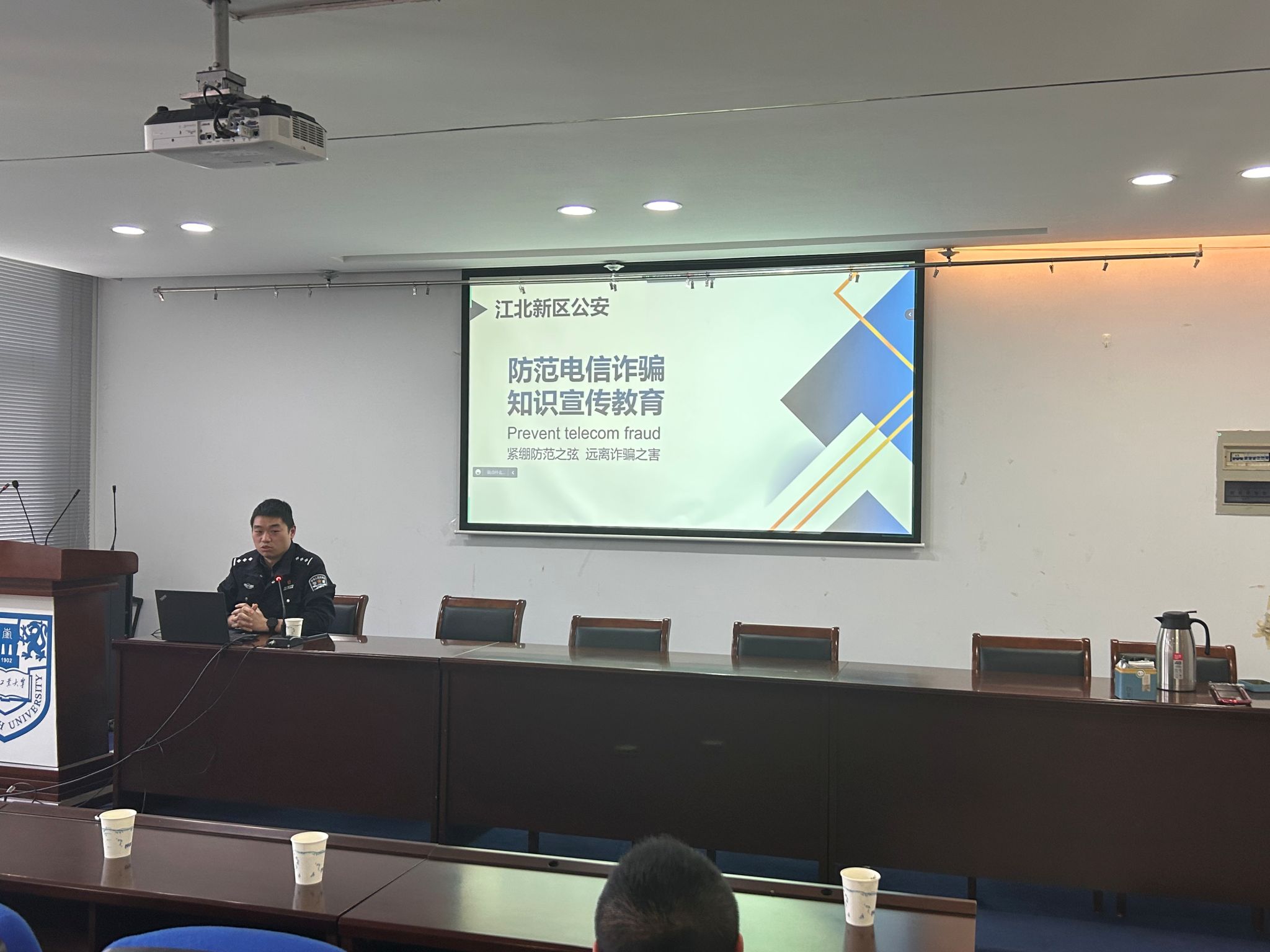 为进一步增强员工国家安全观念,夯实国家安全教育基础,提高员工识骗防骗能力,创建安全和谐校园,4月26日下午,365英国上市公司与校保卫处联合主办“贯彻总体国家安全观,筑牢全民反诈防线”主题讲座。南京市公安局江北新区反恐大队长于淼警官、刑警支队反诈专办石鑫警官受邀带来精彩讲授。校保卫处副处长徐东、经管公司党委副书记岳克勤、公司辅导员、各班反电诈宣传员和主要班委代表参加讲座。