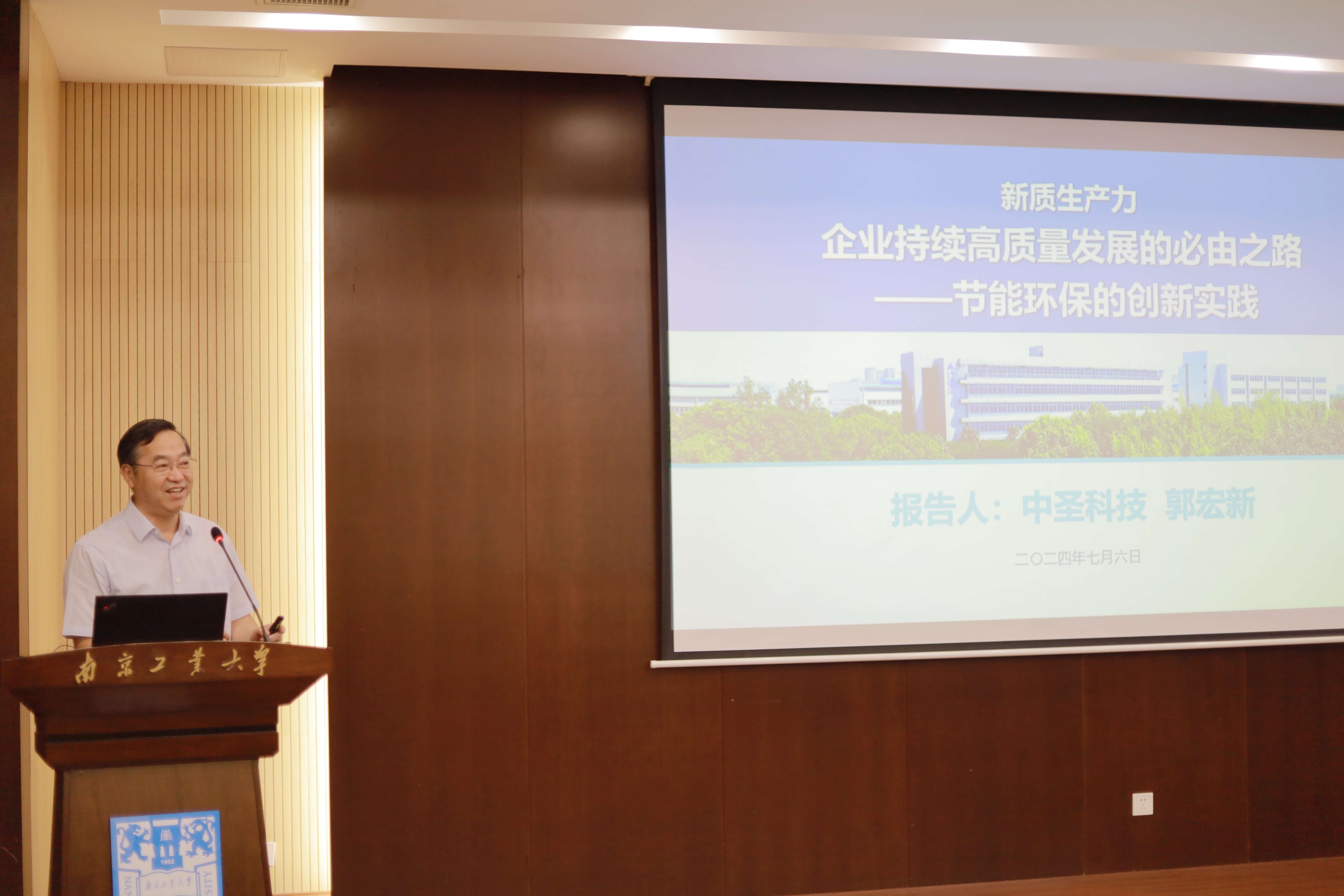公司党委副书记吴胜红致欢迎辞,他简要介绍了公司基本情况,并对管理类人才培养和产学研协同创新提出了希望。南京市企业联合会会长李琦致开场辞,他介绍了协会和联合会情况,对活动开展表达了期望。中圣集团董事会主席、中圣科技(江苏)股份有限公司党委书记、董事长郭宏新作了题为《新质生产力:企业持续高质量发展的必由之路——节能环保的创新实践》精彩报告,他围绕新质生产力,结合自身及团队的实践经验,深入探讨了对新质生产力的理解和认识,指出发展新质生产力是中国经济转型升级的内在要求,要抓住创新的“牛鼻子”,挖掘和发展新业态、新模式、新动能,推动传统产业向高端化、智能化、绿色化转型升级。整个讲座主题鲜明、思路清晰,具有较强的指导性,让与会人员倍受启发。