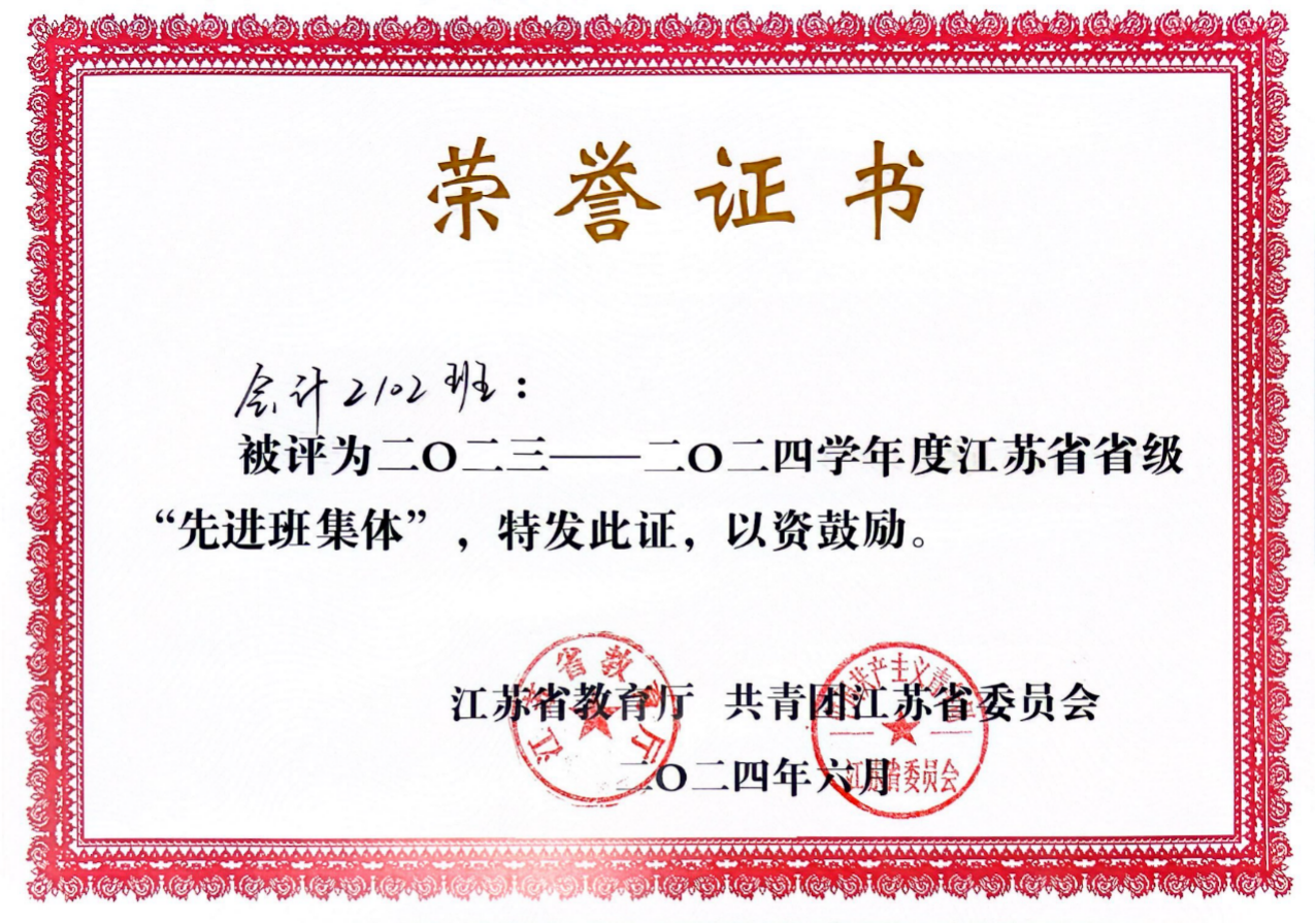 近期,公司在班级建设方面收效显著,喜讯不断,会计2102班被评为2023-2024学年度江苏省省级“先进班集体”。