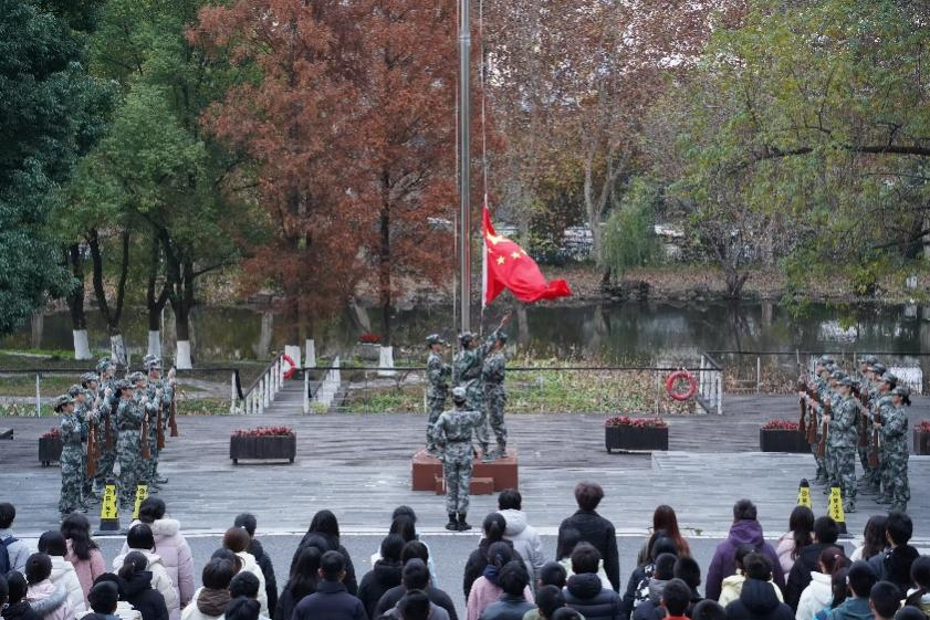 12月9日早上七时升旗仪式正式开始,在全体师生的注目下,英姿飒爽的国旗护卫队护卫着鲜红的五星红旗入场,伴随着庄严的国歌,五星红旗冉冉升起,迎风飘扬。全体师生庄严肃立,向国旗行注目礼,高唱国歌,共同表达对祖国的无限热爱和崇高敬意。