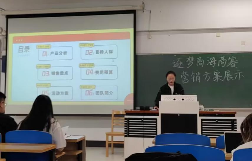 参赛团队通过PPT进行汇报,对营销方案作出了全面的阐释。参赛团队以选定的产品为中心,从产品分析、市场调研、宣传方式、经费预算等多方面进行了详细的介绍,评委们也对各团队进行了专业的点评。经过激烈的角逐,10支队伍脱颖而出,进入实战营销环节。