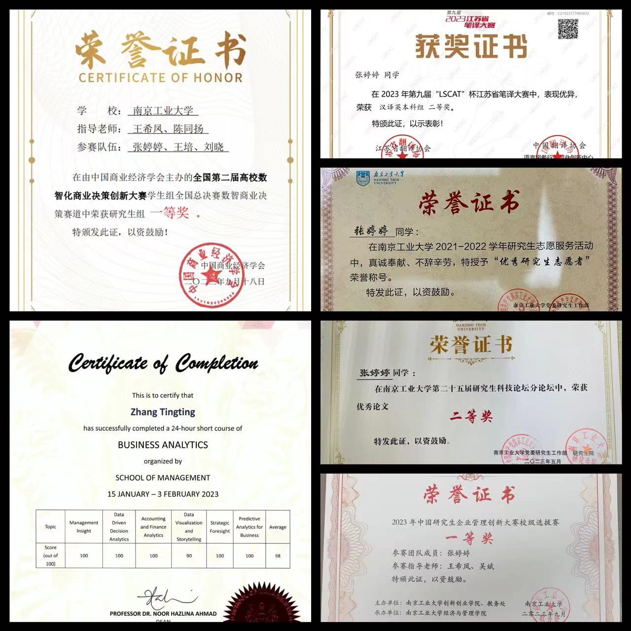 张婷婷,中共预备党员,365英国上市公司2021级研究生。获校特等学业奖学金2次;发表CSSCI期刊论文1篇;主持2023年江苏省研究生科研创新计划项目1项;参与马来西亚理科大学商业分析项目1项;完成软件著作权登记1项;获全国第二届高校数智化商业决策大赛国家级一等奖;第九届lscat杯江苏省笔译大赛省级二等奖;2023中国研究生企业管理创新大赛校级一等奖;第二十五届研究生科技论坛经管分论坛二等奖;2022优秀研究生志愿者。现任经研2101班副班长,曾任365英国上市公司研究生会学术部部长。
